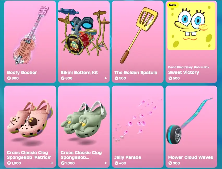 Des objets supplémentaires sont vendus séparément, y compris les Crocs à thème Patrick et les Crocs à thème Squidward au prix de 1 000 V-Bucks chacun, ainsi que le véhicule Patty Wagon pour 2 000 V-Bucks. L'achat de tous les objets disponibles porte le total à 7 000 V-Bucks, ou jusqu'à 7 700 V-Bucks avec des effets supplémentaires et des ajouts visuels.